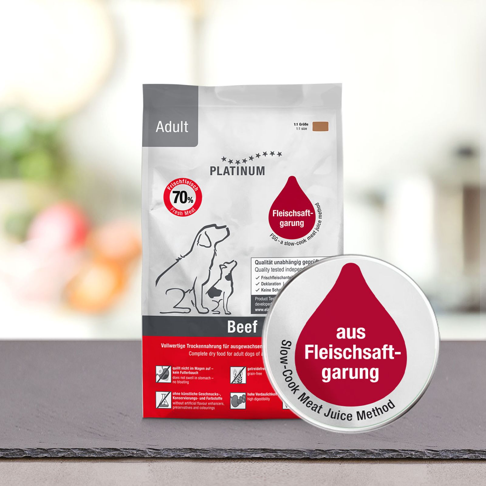 Compared to conventional dry food, which is mainly made from meat meal, the slow-cook meat juice method requires at least 70% fresh meat in order to prepare PLATINUM dry food. The difference between meat meal and fresh meat is very huge. In order to obtain meat meal from fresh meat, the fresh meat has to be heated strongly and exposed to high heat for a long time, often also to high pressure. This removes the nutrient-rich meat juice from the fresh meat in addition to the flavor carrier fat. Meat meal therefore is significantly lower in nutrients than fresh meat. We know from cooking that meat juice and fat make the roast a pleasure in the first place, which is why we do not prepare the Sunday roast with meat meal. Thanks to the slow-cook meat juice method, the PLATINUM dry food does not contain any locks or flavors, no coloring or odorous substances and no flavor enhancers.