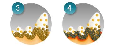 這圖像顯示出在電子顯微鏡下放大6000倍受到牙垢影響的牙齒。 多孔的牙垢(染成藍色),為細菌(染成綠色和紫色)提供了完美的環境進行繁殖。